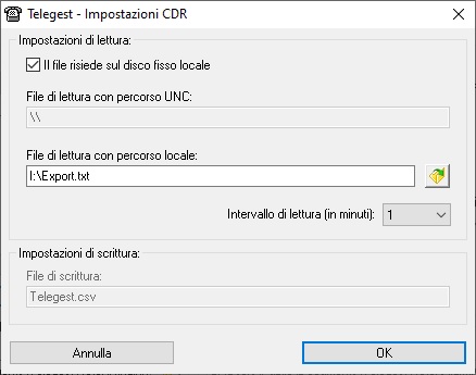 Con questo tipo di connessione è possibile creare un collegamento CDR con un centralino telefonico IP. Se si tratta di una connessione bidirezionale è necessario impostare anche il File di scrittura. Questo file verrà creato nella stessa cartella dove si trova il file di lettura. Questa connessione non è una connessione IP reale ma si basa esclusivamente sulla lettura e scrittura di file CSV nella rete.
